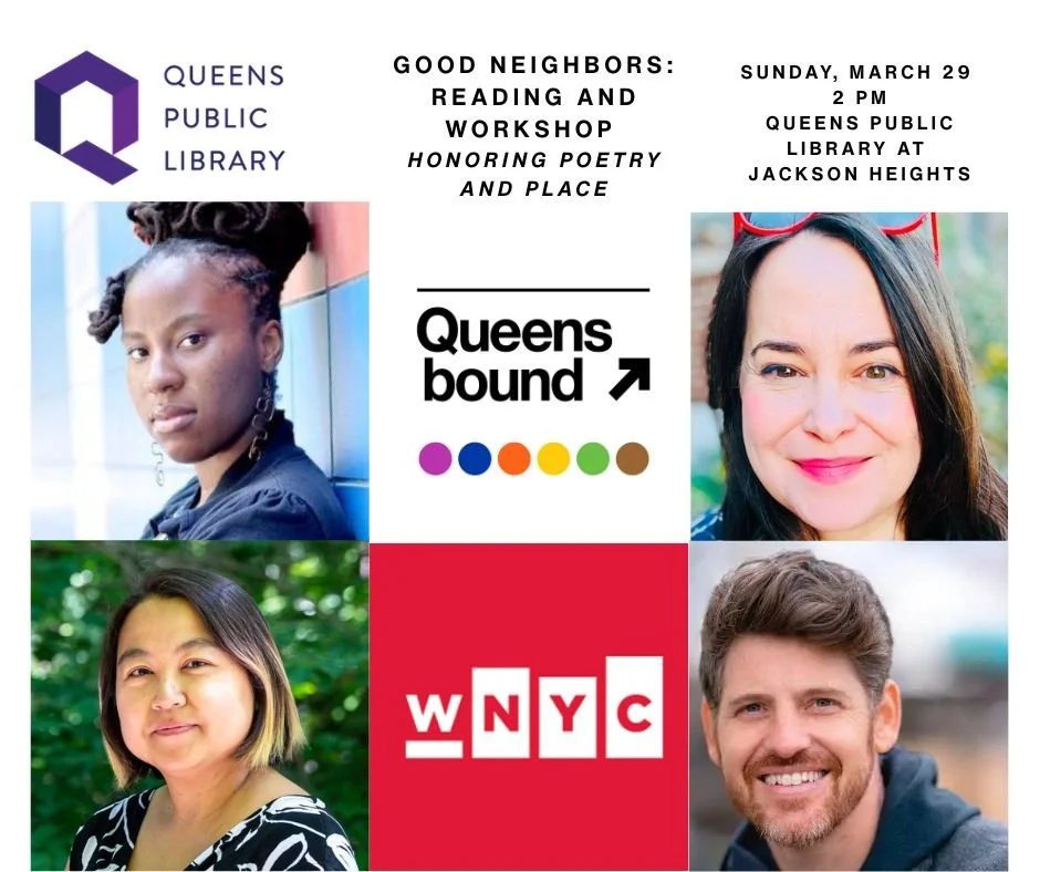 3/29 - Good Neighbors Reading and Workshop - Honoring Poetry and Place - Sunday, March 29, 2026 | 2-4 PM Queens Public Library at Jackson Heights 35-51 81st St, Jackson Heights, NY 11372 - in partnership with WNYC, join QUEENSBOUND Ed Board Members Pichchenda Bao, Jared Harél, Sherese Francis, and KC Trommer, in Jackson Heights to learn about the project and 2026 WNYC National Poetry Month programming theme: “Good Neighbors.” Free and open to the public. RSVP recommended.